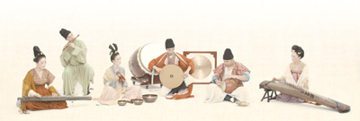 淡黃色的背景如宣紙鋪陳,樂師們身著朱紅圓領袍、艾綠上衣、藕色絹衫等,或撫古琴,或吹笛簫,或擊大鼓……演奏的是中國傳統樂器,流淌的樂音卻是電影《哈利·波特》主題曲、巴赫《G弦上的詠嘆調》……