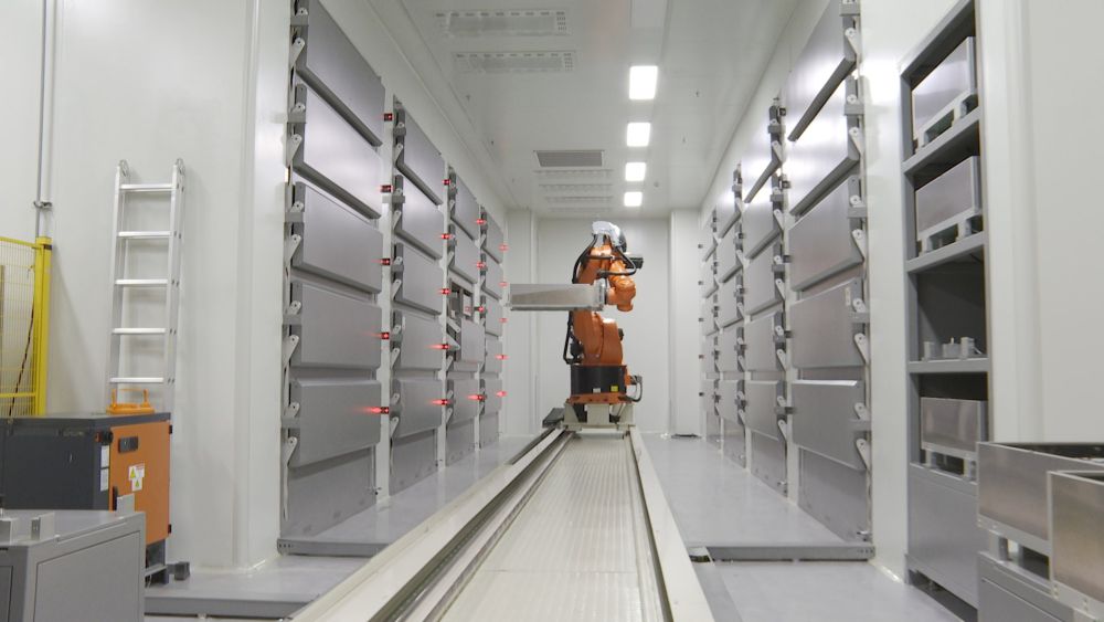 在一家企業的干燥車間內,六軸機器人正在搬運成品電池。(受訪單位供圖)