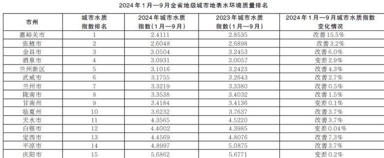 2024年1月—9月,全省14個地級城市及蘭州新區地表水環境質量綜合排名由優至劣分別為:嘉峪關市、張掖市、金昌市、酒泉市、蘭州新區、武威市、蘭州市、隴南市、甘南州、臨夏州、天水市、白銀市、定西市、平涼市、慶陽市。