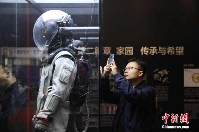 資料圖:展出的電影《流浪地球》中的服裝道具“地表防護(hù)服”吸引觀眾。中新社記者 蔣啟明 攝