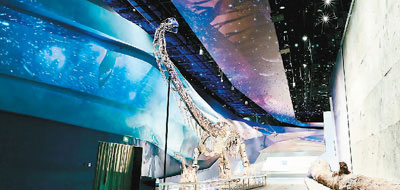 進入展廳,人們首先會被來自侏羅紀時代的龐然大物——中加馬門溪龍化石所震撼。馬門溪龍是中國發現的體型最大的蜥腳類恐龍之一,頸部特別長。這具化石出土于新疆奇臺縣,2016年修復裝架完成,高7.5米,長24米,脖子就有12米長。