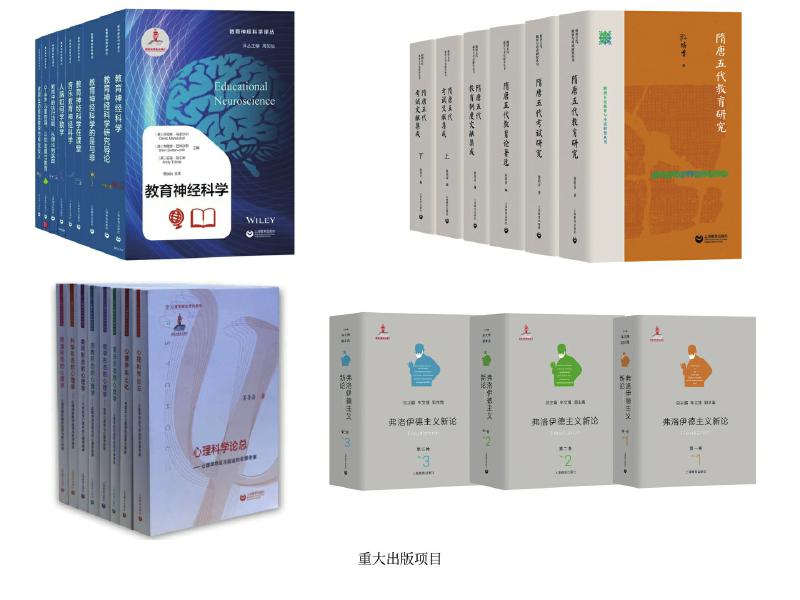 上教社密切關(guān)注新時(shí)代教育發(fā)展的重大理論問題與現(xiàn)實(shí)問題,響應(yīng)國家教育發(fā)展戰(zhàn)略需求,精心布局學(xué)術(shù)專業(yè)出版“大項(xiàng)目”,連續(xù)入選國家重點(diǎn)出版物出版規(guī)劃、2013—2025年國家辭書編纂出版規(guī)劃,獲國家出版基金資助。這其中除前文中的大型專科工具書,還包括一系列教育與心理學(xué)原創(chuàng)研究和前沿研究成果:由中國教育史學(xué)者孫培青編著的“隋唐五代教育與考試研究叢書”,構(gòu)建了反映隋唐五代教育與考試全貌的教育理論體系和文獻(xiàn)資料體系,是中國教育史學(xué)科建設(shè)的一項(xiàng)學(xué)術(shù)文化積累工程;《中國課程史》以現(xiàn)代課程理論為分析框架,以歷史線索展現(xiàn)中國學(xué)校課程的新陳代謝;“教育神經(jīng)科學(xué)譯叢”(9冊(cè))是我國首個(gè)聚焦教育神經(jīng)科學(xué)這一國際教育研究前沿領(lǐng)域的學(xué)術(shù)譯介系列;《中國傳統(tǒng)德育心理學(xué)思想新論》系統(tǒng)挖掘整理中華優(yōu)秀傳統(tǒng)文化中蘊(yùn)含的德育心理學(xué)思想,構(gòu)建中國特色心理學(xué)話語體系;我國第一套以大心理學(xué)觀,從本土心理學(xué)視角系統(tǒng)探索和解讀不同形態(tài)心理學(xué)的學(xué)術(shù)系列“心理學(xué)形態(tài)研究系列”(6冊(cè)),全景考察心理學(xué)的命運(yùn)與前途,深入探索中國本土心理學(xué)的選擇與突破;《弗洛伊德主義新論》(三卷)匯聚國內(nèi)弗洛伊德主義研究領(lǐng)域的權(quán)威學(xué)者,歷史展現(xiàn)弗洛伊德理論的百年發(fā)展歷程,提供弗洛伊德主義研究的“全景圖”。這些重大出版項(xiàng)目為構(gòu)建中國特色自主知識(shí)體系,建設(shè)中國教育學(xué)和心理學(xué)學(xué)科體系、學(xué)術(shù)體系、話語體系發(fā)揮了重要作用。