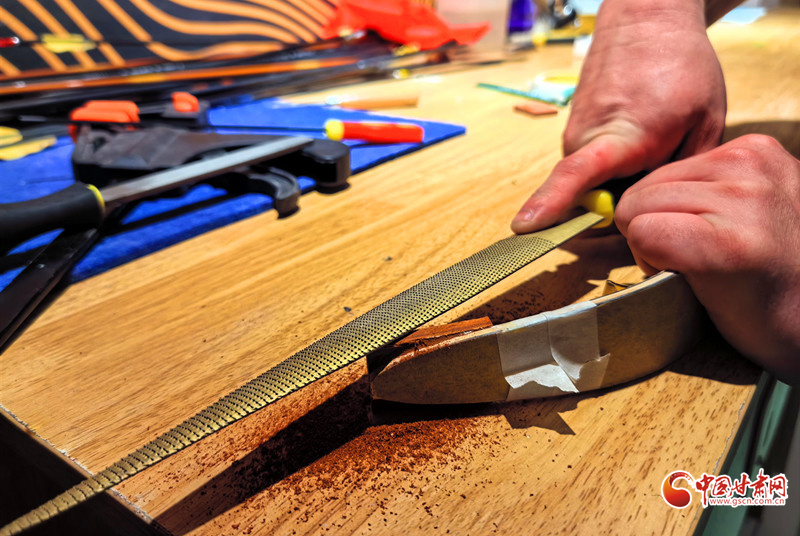 2011年,還是大學(xué)生的謝建戈在百度貼吧結(jié)識(shí)了山東臨沂“高氏傳統(tǒng)弓箭”非遺傳承人高超。囊中羞澀的他提出“先貨后款”,高超被這份赤誠(chéng)打動(dòng),寄來(lái)第一套玻片弓料。一個(gè)月后,生活費(fèi)一到賬,他第一時(shí)間把錢打了過(guò)去——網(wǎng)絡(luò)那端的高超從此記住了這個(gè)甘肅小伙。2012年,他做出人生第一把玻片弓。