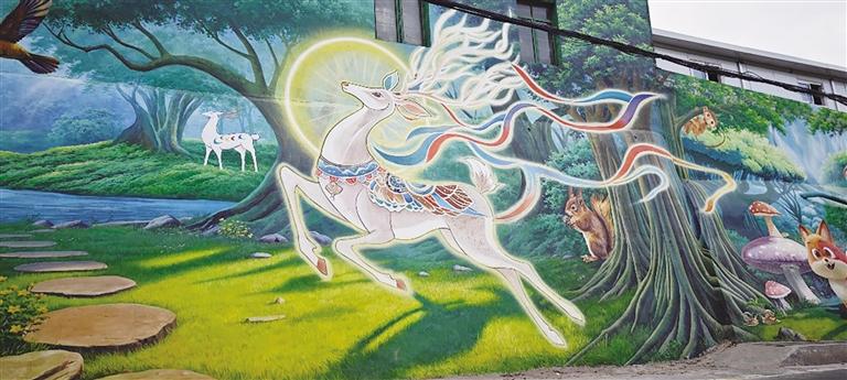 這些色彩斑斕的墻繪以城關區深厚的文化底蘊為底色,將民俗風情、自然生態與城市記憶巧妙交織。在伏龍坪街道,一面巨幅“舞獅”墻繪氣勢恢宏,紅黃相間的獅子昂首騰躍;在山間步道旁,“九色鹿”悠然立于云霧之間,靈動雙眸映照山河,將敦煌文化的神秘與自然之美娓娓道來。