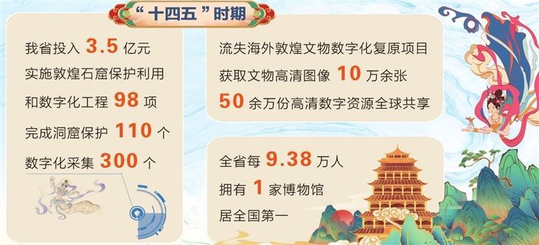 在文物保護提質升級方面,我省投入3.5億元,實施敦煌石窟保護利用和數字化工程98項,完成洞窟保護110個、數字化采集300個,建成全球首個文物保護多場耦合實驗室,制定國家和行業標準27項,科研成果服務16省市及部分共建“一帶一路”國家;流失海外敦煌文物數字化復原項目獲取文物高清圖像10萬余張,50余萬份高清數字資源全球共享;第四次全國文物普查新發現線索4659條,投入24.26億元實施900余項重要文保項目;打造河西走廊國家遺產線路,創建嘉峪關長城國家文物保護利用示范區,全省文物系統性保護成效顯著,“中國特色?敦煌經驗”國際影響力持續提升。