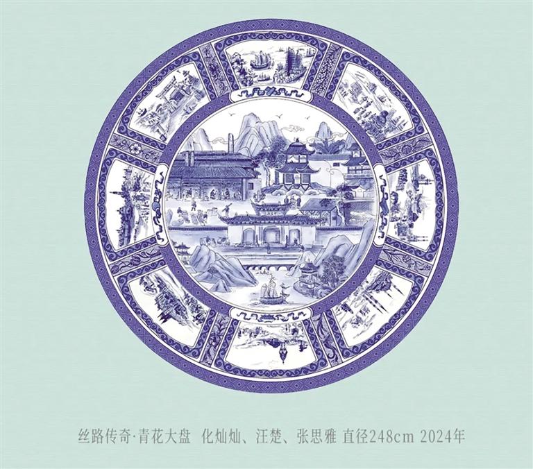 值得關注的是,展品中既有莫高窟第328窟復制彩塑這樣的經典再現,也有直徑達248厘米的“絲路傳奇·青花大盤”,呈現出多元文明共生的歷史圖景。瓷器作品是江西瓷藝大師歷時多年、多次赴敦煌采風創作的結晶,通過高溫顏色釉的窯變特性,將敦煌壁畫的斑駁肌理與礦物顏料的神秘色彩凝固定格,在釉色流淌間實現古典美學與現代工藝的完美融合。