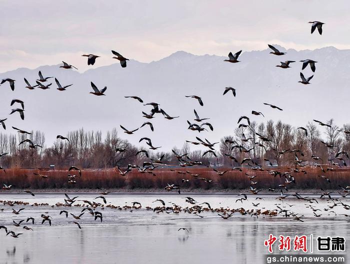 在黑河濕地國家級自然保護區高臺段,蜿蜒的河道與開闊的水面已成為候鳥的臨時家園。